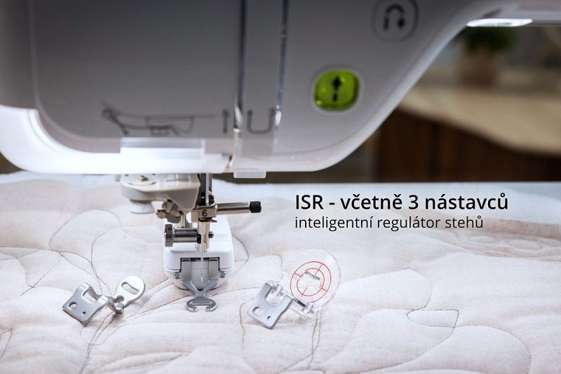 | Obrovskou výhodou při šití je vestavěné laserové vodítko šití. Stroj vám svítí rovnou čáru v místě, kde si sami určíte a díky tomu bude vaše šití dokonale přesné. | ISR - Inteligentní Regulátor Stehů se třemi různými nástavci. Pohlídá při volném quiltování, abyste měli každý steh stejně dlouhý a můžete si vybrat uzavřenou, otevřenou nebo talířkovou echo patku. | |