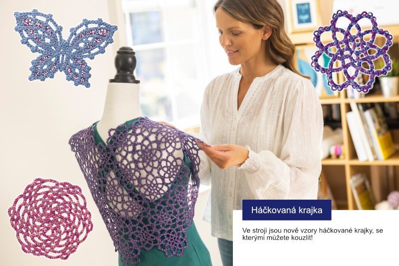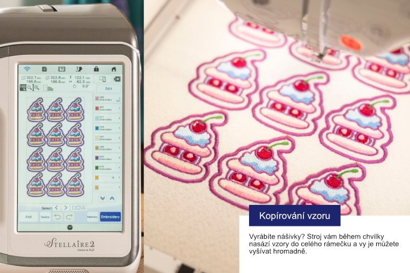 - editace vzorů na displeji stroje - otáčení, změna velikosti, skládání více vzorů k sobě, psaní textu