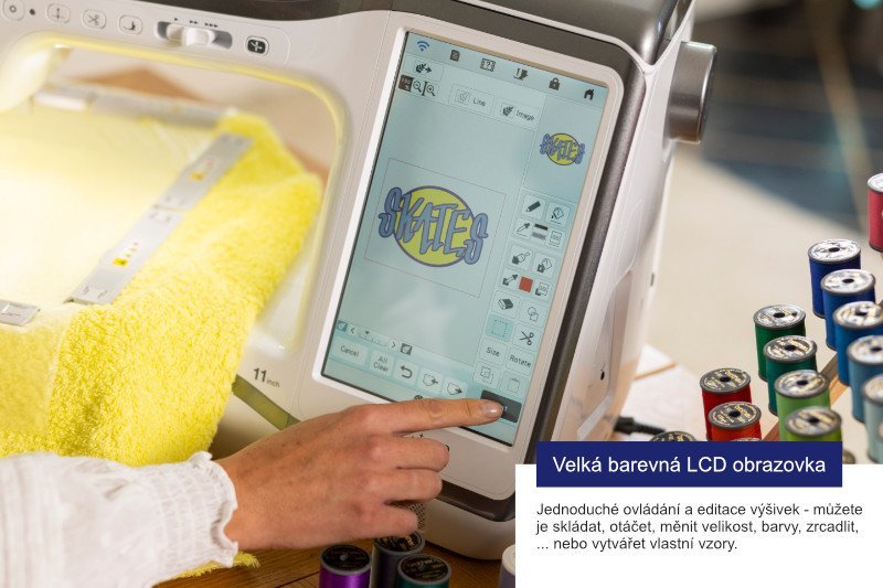 Stroj je vybaven plně funkčním systém editace výšivky na obrazovce