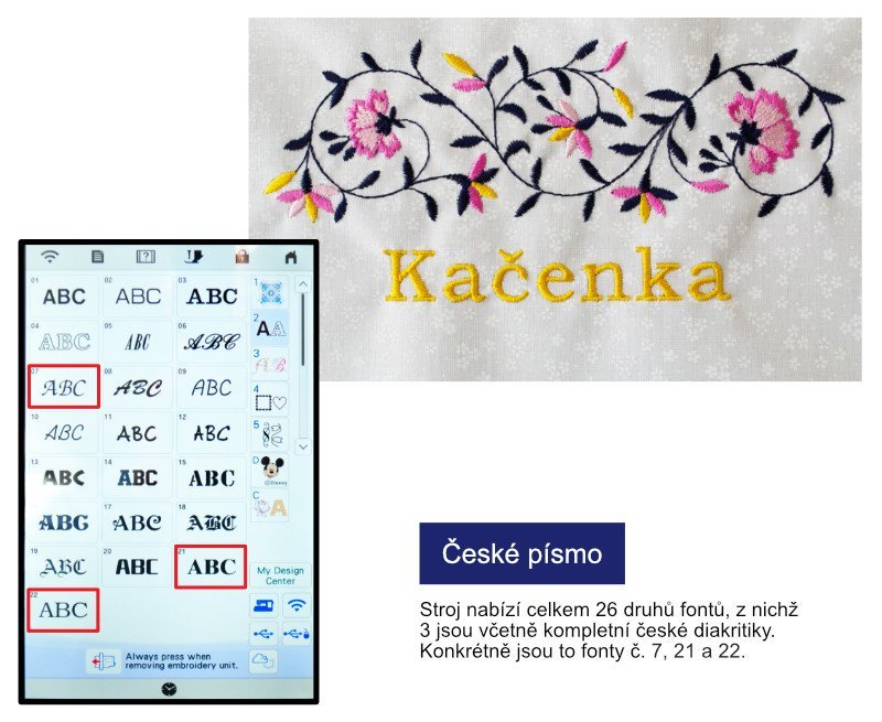 Stroj má v paměti 889 vzorů výšivek, z toho 101 Disney, ze kterých můžete vybírat výšivky pro své projekty. Přímo ve stroji je také 17 různých fontů písma, která můžete vyšívat bez použití počítače. Výšivky do stroje můžete přenášet rychle pomocí USB flash disku, pokud máte software Brother PE Design 11, jde vzory posílat i po Wi-Fi.