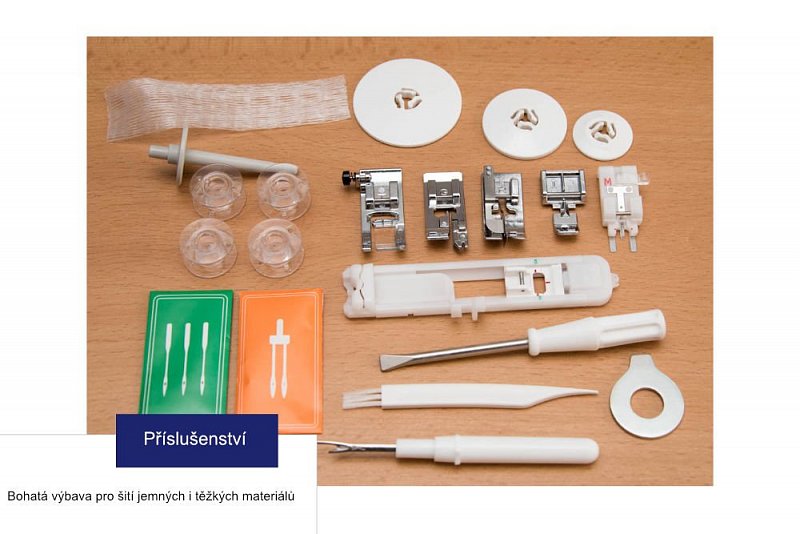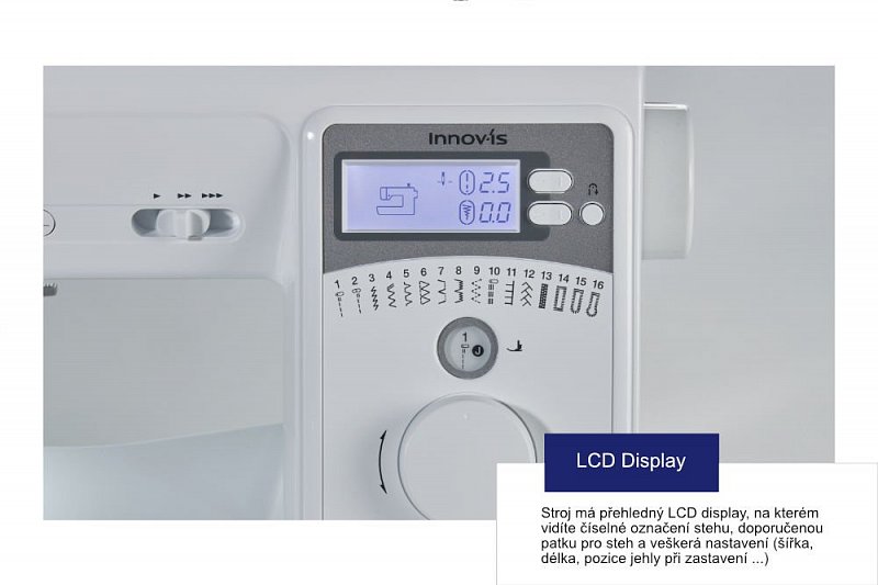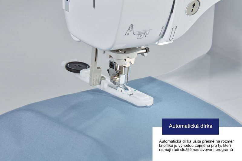16 užitečných i dekorativních stehů z toho 3 druhy knoflíkových dírek včetně konfekční dírky automaticky šitých přesně na rozměr knoflíku je výhodou zejména pro ty, kteří nemají rádi složité nastavování programů.