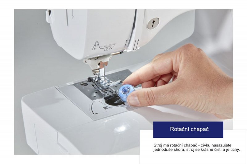 Rychlá příprava stroje pro šití po jednoduchém vložení cívky spodní nitě do cívkového pouzdra bez otáčení ručním kolem. Průhledný kryt umožňuje sledovat zásobu nitě na cívce v cívkovém pouzdře.