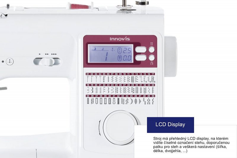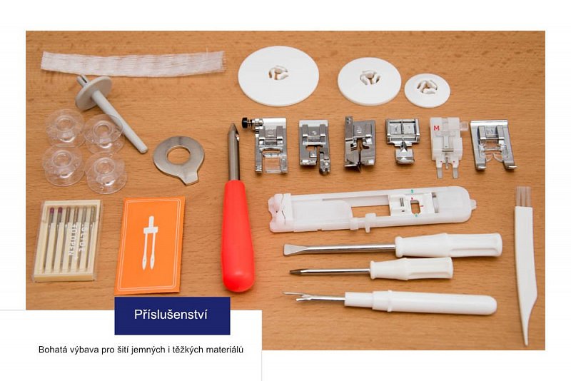 50 druhů stehů, regulace rychlosti, automatické zapošití, overlockové stehy, ozdobné stehy, šití bez pedálu.