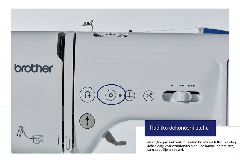 šití pomocí tlačítka umístěného pod displejem stroje.