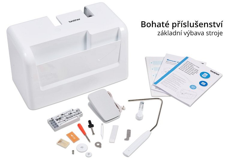 Samozřejmostí je volné rameno pro šití nohavic a rukávů, robustní celokovové tělo stroje, ergonomicky umístěná tlačítka, možnost ponoření podavače pod stehovou desku při látání a quiltování, LED osvětlení, rychlá výměna patek pouhým nacvaknutím. Brother používá moderní tiché rotační chapače, které se jednoduše čistí, nit nasadíte během okamžiku a během šití průhlednou krytkou vidíte, kolik nitě vám zůstává na cívce. V přihrádce na příslušenství najdete praktický pořadač na patky, takže máte vše připraveno.