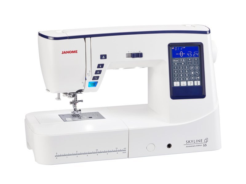 Šicí a quiltovací stroj Janome Skyline S5 AE je speciálně vybavený stroj pro quiltování, má 496 programů, 11 typů knoflíkových dírek. Tento stroj je větší než běžné stroje, silnější a má možnost šít vyššími otáčkami až 1000 stehů/min. Tento šicí stroj se chlubí větší základnou, delším ramenem, které je až 21 cm dlouhé, možnost šíře cik-caku 9 mm. Jen díky tomu můžete u tohoto stroje s úžasem využít tolik různých stehů. Je to téměř nekonečné množství možností. Většina prodejců tento stroj řadí do kategorie vyšívacích.
