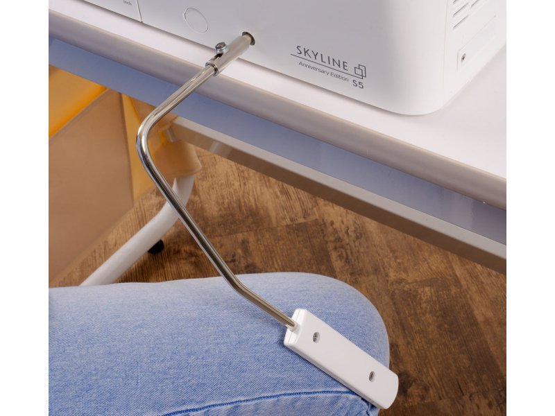Kolenní páka umožňující zdvih patky nohou. Díky tomu můžete mít obě ruce neustále na materiálu a lépe s ním manipulovat. Toto je standardní příslušenství u průmyslových strojů, ale Janome ví, jak je to důležité i pro vaše projekty.