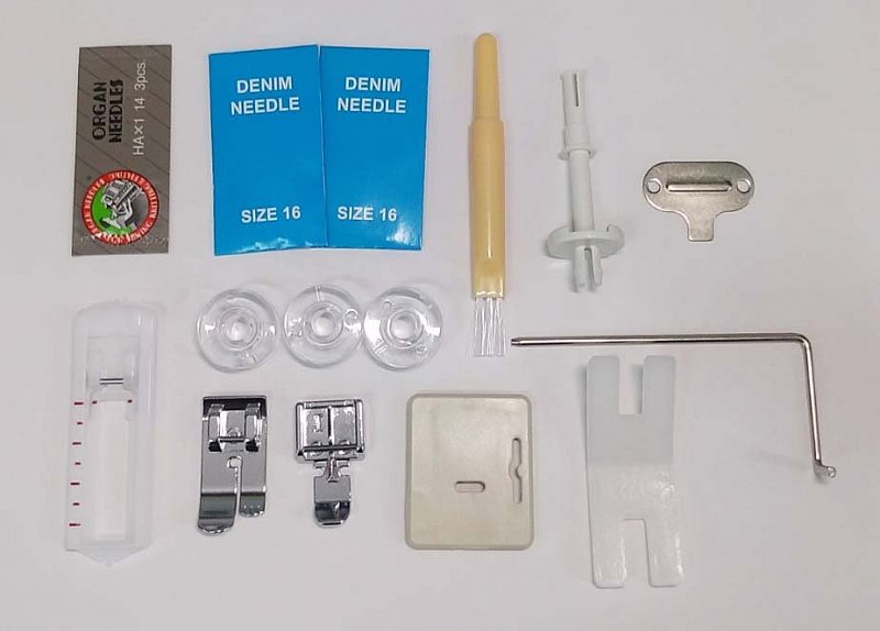 Stroj se dodává v kvalitní fotografické krabici, která je vhodná i jako dárkové balení a s bohatým příslušenstvím, ke kterému patří např. patka pro šití knoflíkových dírek, zipová patka i sada jehel pro šití džínsoviny.